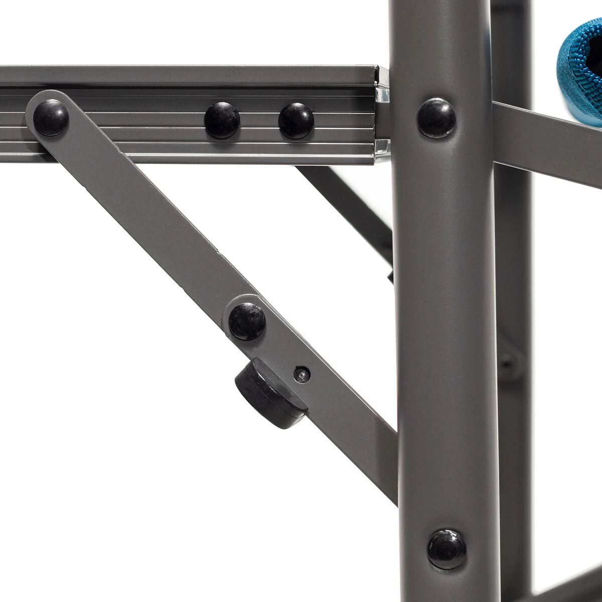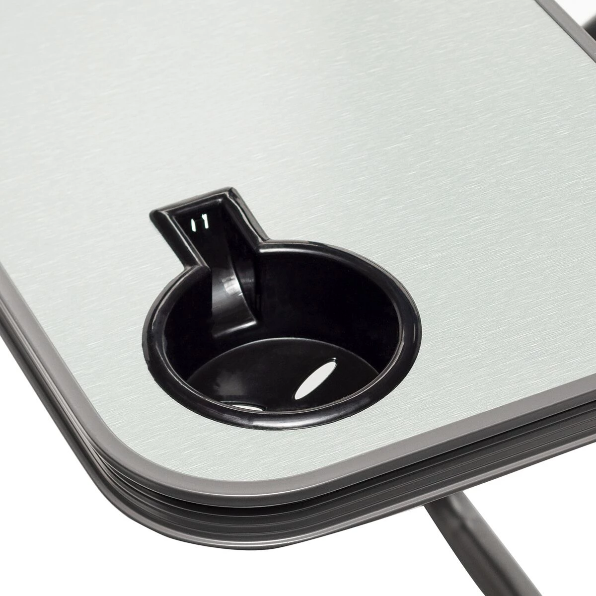 - Folding side table includes a cup holder for securing your beverage